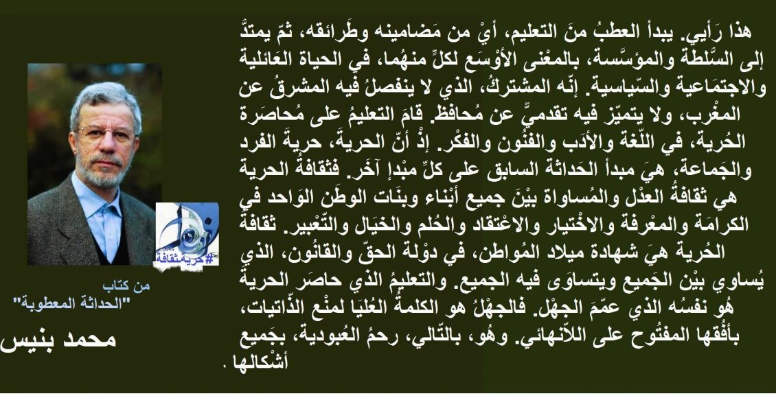 وإذا كانَ الربيعُ العربيُّ فاجأنا مثلما فاجَأ العالَم، فإن وُصول الإسلاميين إلى السلطة، عن طريق الدّيمقراطية، التي كانُوا يكفّرونها ويكفّرون المنادين بهَا، لمْ يكُنْ مُفاجئاً. هلْ هُوَ المآلُ الحتْميُّ للحدَاثة المعطُوبة ؟ عواملُ عديدةٌ تدعُوني للإجابة بالإثبَات. فالعطبُ، الذي قادَنا إلى هذا المآل، ثقافيٌّ ومنْ طبيعة ثقافيّة. هذا رَأيي. يبدأ العطبُ منَ التعليم، أيْ من مَضامينه وطَرائقه، ثمّ يمتدُّ إلى السُّلطة والمؤسَّسة، بالمعْنى الأوْسَع لكلٍّ منهُما، في الحياة العَائلية والاجتمَاعية والسّياسية. إنّه المشتركُ، الذي لا ينفصلُ فيه المشرقُ عن المغْرب، ولا يتميّز فيه تقدميٌّ عن مُحافظ. قامَ التعليمُ على مُحاصَرة الحُرية، في اللّغة والأدَب والفنُون والفكْر. إذْ أنّ الحريةَ، حريةَ الفرد والجَماعة، هيَ مبدأ الحَداثة السابق على كلِّ مبْدإ آخَر. فثقافةُ الحرية هي ثقافةُ العدْل والمُساواة بيْنَ جميع أبْناء وبنَات الوطَن الوَاحد في الكرامَة والمعْرفة والاخْتيار والاعْتقاد والحُلم والخيَال والتّعْبير. ثقافةُ الحُرية هيَ شهادة ميلاد المُواطن، في دوْلة الحقّ والقانُون، الذي يُساوي بيْن الجَميع ويتساوَى فيه الجميع. والتعليمُ الذي حاصَر الحريةَ هُو نفسُه الذي عمّمَ الجهْل. فالجهْلُ هو الكلمةُ العُليَا لمنْع الذّاتيات، بأفُقها المفتُوح على اللاّنهائي. وهُو، بالتّالي، رحمُ العُبودية، بجَميع أشْكالها. أغلالٌ تَنْزعُ الوضْعَ الإنسانيَّ عَن الإنْسان. هذا ما سَعَى التّعليمُ إليْه. وهَا هيَ عواصفُ الجهْل تنزلُ منَ الأعَالي التي لا نَراها، وتنتشرُ في حَياتنا، الفرديّة والجَماعيّة، باسْم الحقيقة الأبَديّة.”